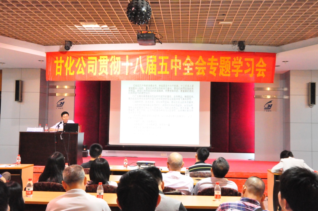 2016年5月17日下午,在甘化大厦17楼会议厅,公司党委举办贯彻党的十八届五中全会精神专题学习会,会议由党委书记、工会主席方小潮领学主讲,重点学习贯彻党的十八届五中全会精神、十三五规划纲要和全国两会精神。公司本部、德力光电、生物中心党、工、青、妇等员工70多人参加了会议。