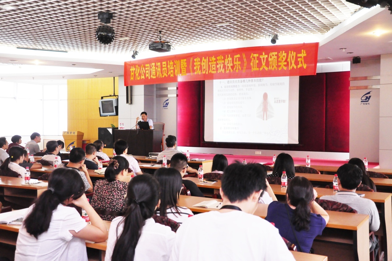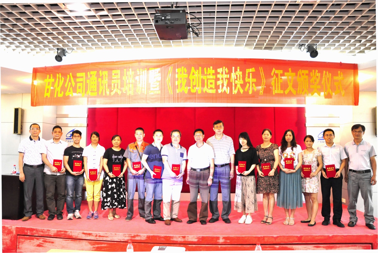 2016年8月25日下午,在甘化大厦17楼会议厅,公司党委、工会举办通讯员培训暨《我创造,我快乐》获奖征文颁奖仪式。培训由党委书记、工会主席方小潮主讲。公司党委委员、各支部委员、工会委员和各单位通讯员等49人参加了会议。