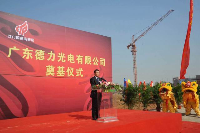 奠基仪式由高新区管委会副主任费伟东先生主持,甘化股份董事长兼总裁麦庆华先生和江门市政协副主席谭继祖先生分别在会上致辞。最后,在轰鸣的礼炮声中,各位领导为广东德力光电有限公司外延片、芯片生产项目埋下了奠基石,奠基仪式在一片祝福声中圆满结束。